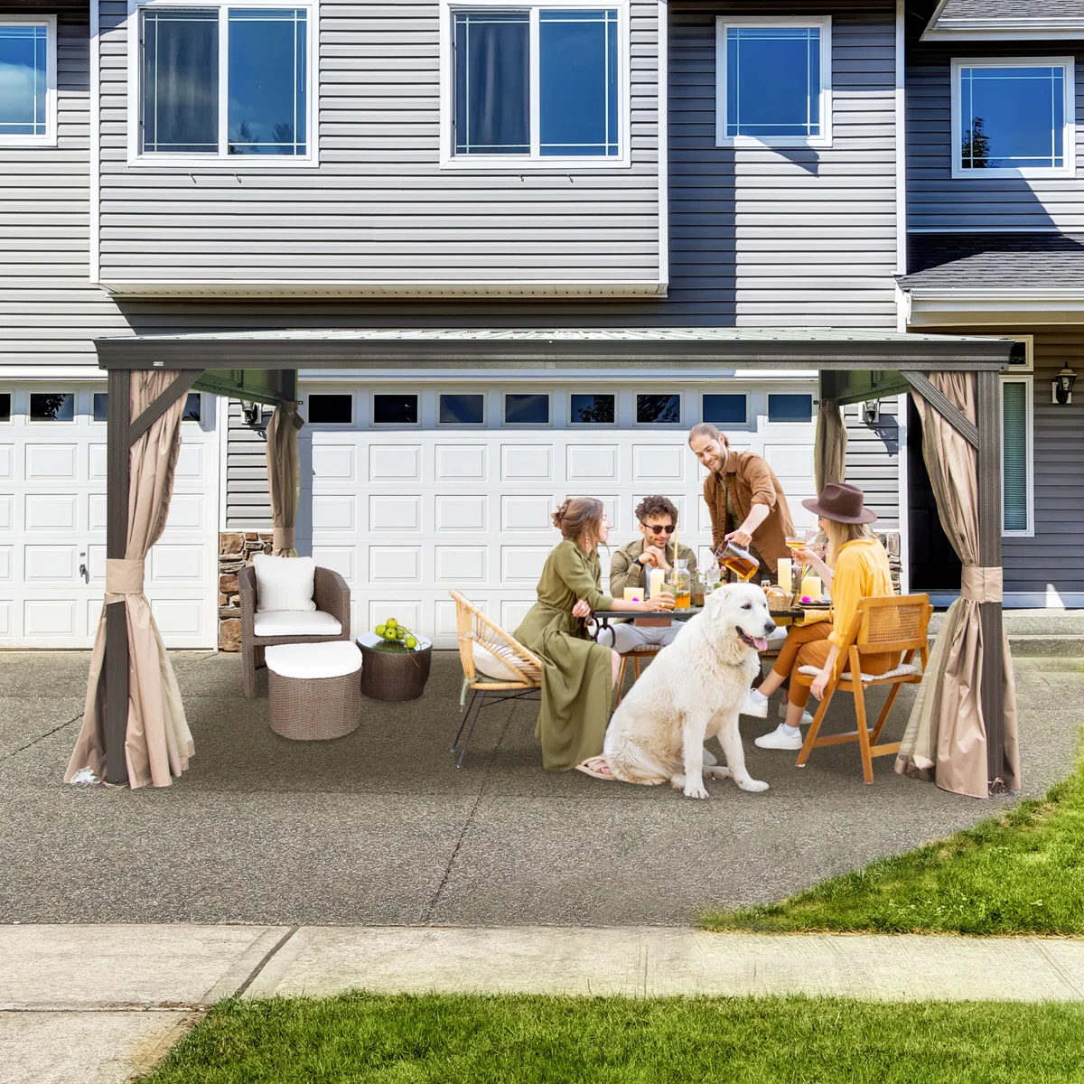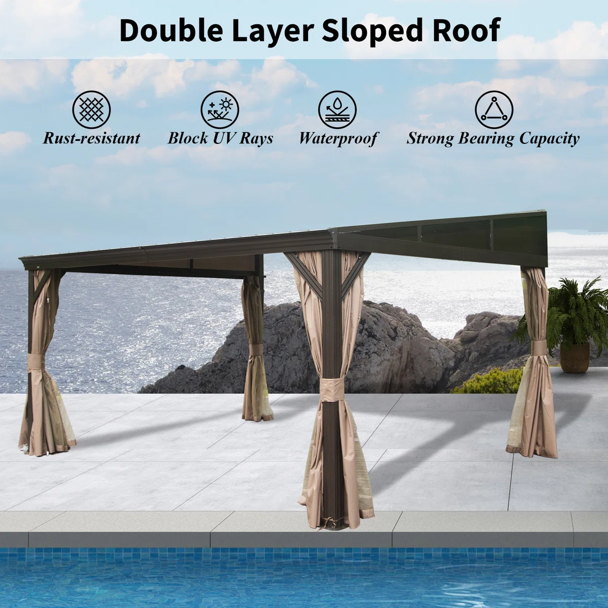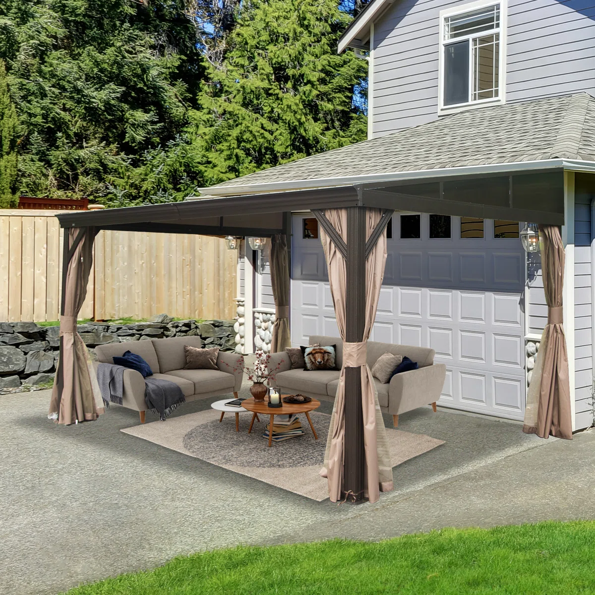 Transform your outdoors with our stunning Lean-to-Gazebo! This wall-mounted Hardtop Gazebo boasts a sleek design, featuring a sloping galvanized steel roof for durability and style. Its sturdy aluminum frame ensures stability, while the included curtains and netting add both elegance and protection from the elements. Create your perfect outdoor haven with this versatile Wall Pergola!